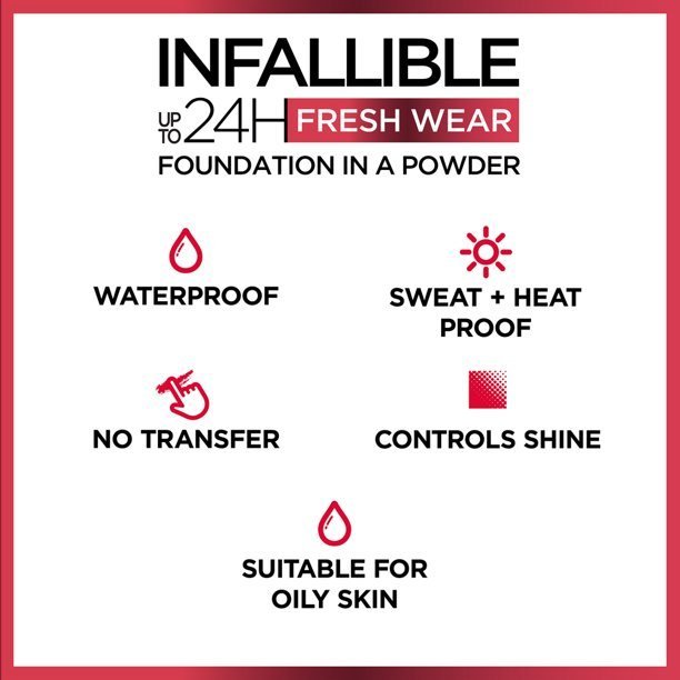 Demand more from longwear with this Viral TikTok Favorite-- Infallible up to 24hr fresh wear foundation-in-a-powder covers like a liquid and mattifies like a powder with no cakey look. The lightweight; thin powder texture gives full coverage and a natural matte finish that feels breathable and weightless; leaving skin feeling comfortable for up to 24hrs. With a blurring effect and all day shine control; this powder gives an even finish that does not transfer. It is waterproof; heatproof and sweatproof. Available in 20 shades and suitable for all skin types; oily skin and acne prone skin. It is non-comedogenic with no oily feel and has been tested under dermatological control Up to 24hr coverage