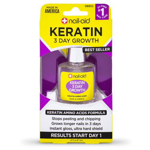 Achieve long and healthy nails using this NAIL-AID 3-day growth keratin amino acids formula. It absorbs into soft, weak layers to give them maximum strength. This nail growth accelerator contains keratin a hardening protein that helps stop peeling and chipping. It also dries fast in minutes and grows nails in just three days. This formula offers ultra long-wear along with a glossy, armor-hard finish. It's also clinically tested for fast, visible results.